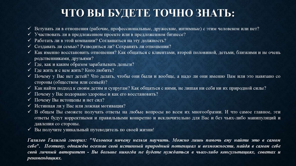 ЧТО ВЫ БУДЕТЕ ТОЧНО ЗНАТЬ:Вступать ли в отношения (рабочие, профессиональные, дружеские, интимные) с этим человеком или нет?