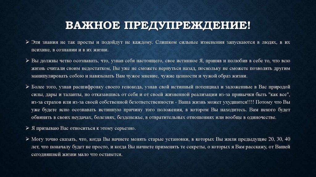 ВАЖНОЕ ПРЕДУПРЕЖДЕНИЕ!Эти знания не так просты и подойдут не каждому. Слишком сильные изменения запускаются в людях, в их