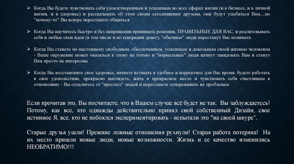 Когда Вы будете чувствовать себя удовлетворенным и успешным во всех сферах жизни (и в бизнесе, и в личнойжизни, и в здоровье) и рассказывать об этом своим сегодняшним друзьям, они будут улыбаться Вам....но