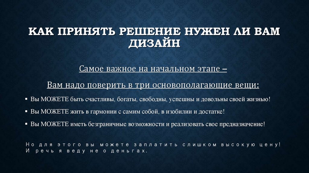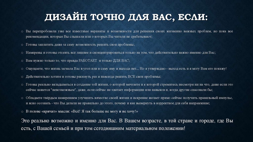ОБРАЩАЮ ВАШЕ ВНИМАНИЕ НА ТО, ЧТО ДЛЯ ПОЛНОГО ПОНИМАНИЯ СВОЕГО ДИЗАЙНА Я НЕ РЕКОМЕНДУЮ