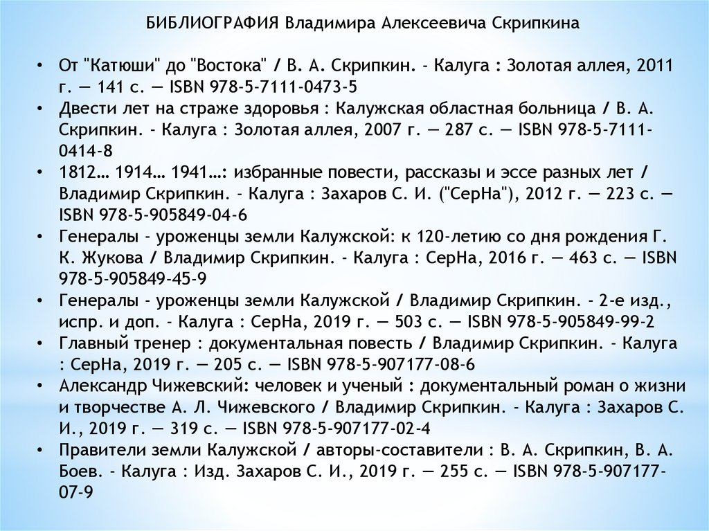 БИБЛИОГРАФИЯ Владимира Алексеевича Скрипкина• От "Катюши" до "Востока" / В. А. Скрипкин. - Калуга : Золотая аллея, 2011