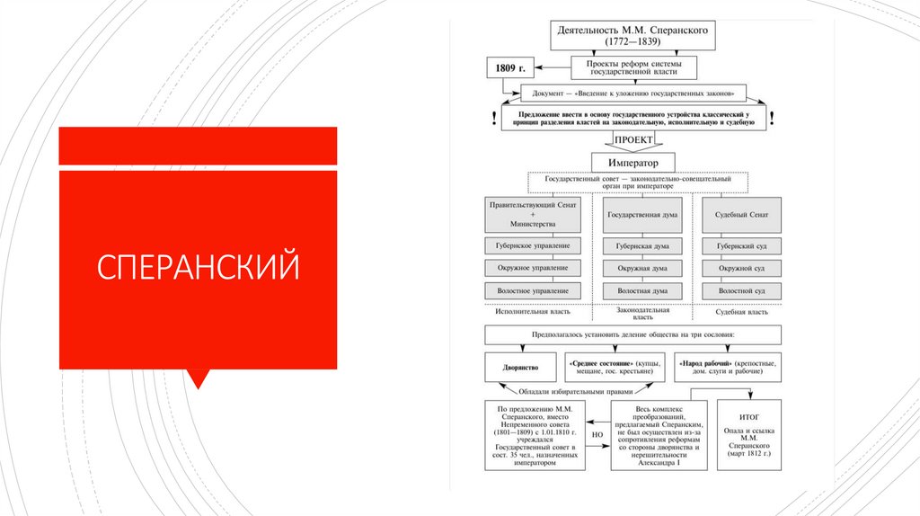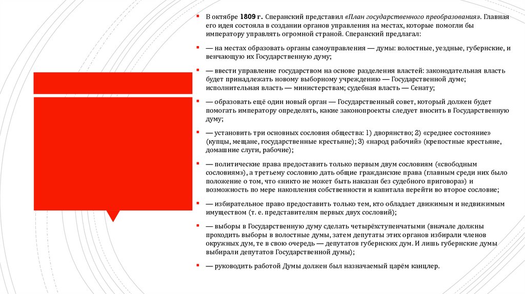 В октябре 1809 г. Сперанский представил «План государственного преобразования». Главнаяего идея состояла в создании органов управления на местах, которые помогли бы