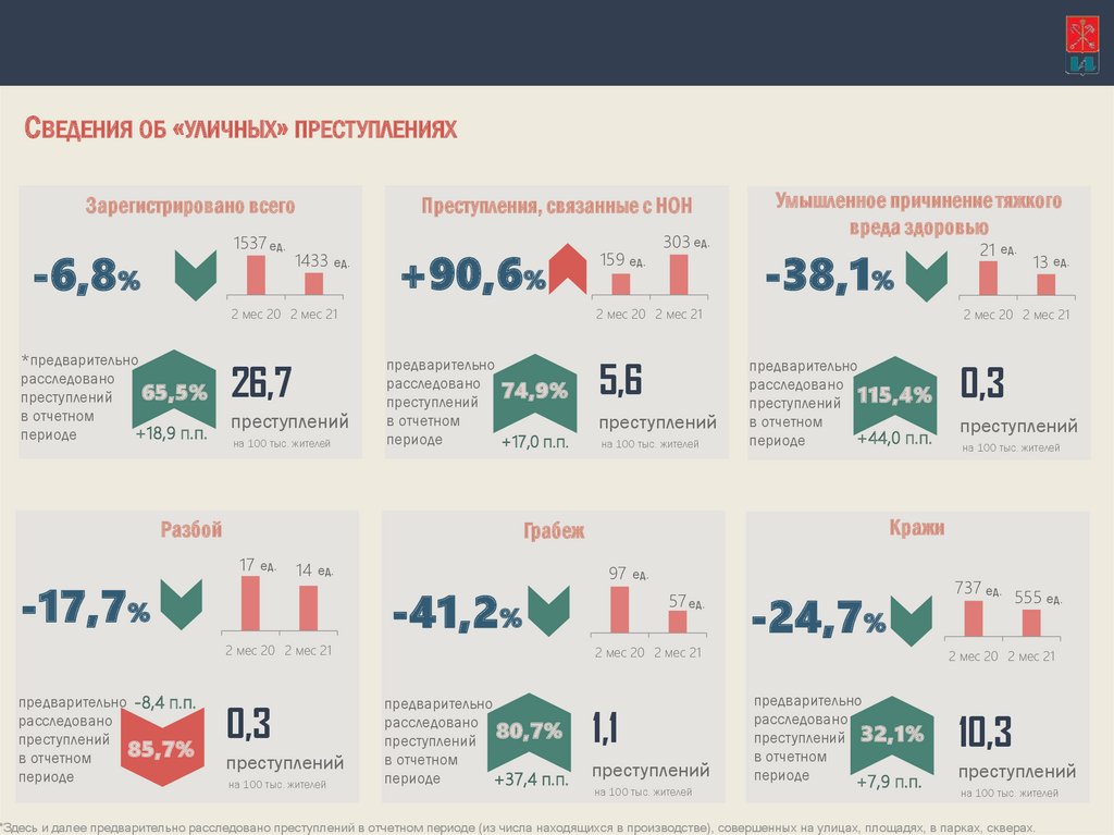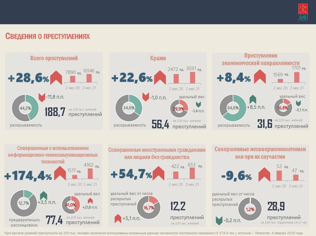 *Для расчета уровней преступности на 100 тыс. человек населения использованы актуальные данные численности постоянного населения (5 378,4 чел.), источник – Петростат, 4 квартал 2020 года.