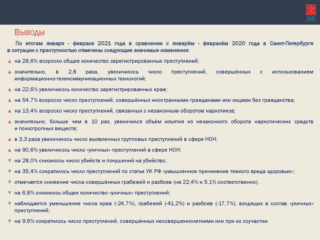 ВЫВОДЫПо итогам января - февраля 2021 года в сравнении с январём - февралём 2020 года в Санкт-Петербурге
