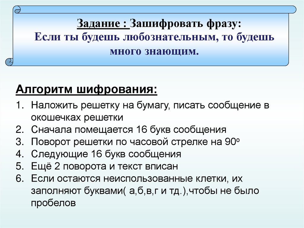 Алгоритм шифрования:1. Наложить решетку на бумагу, писать сообщение в