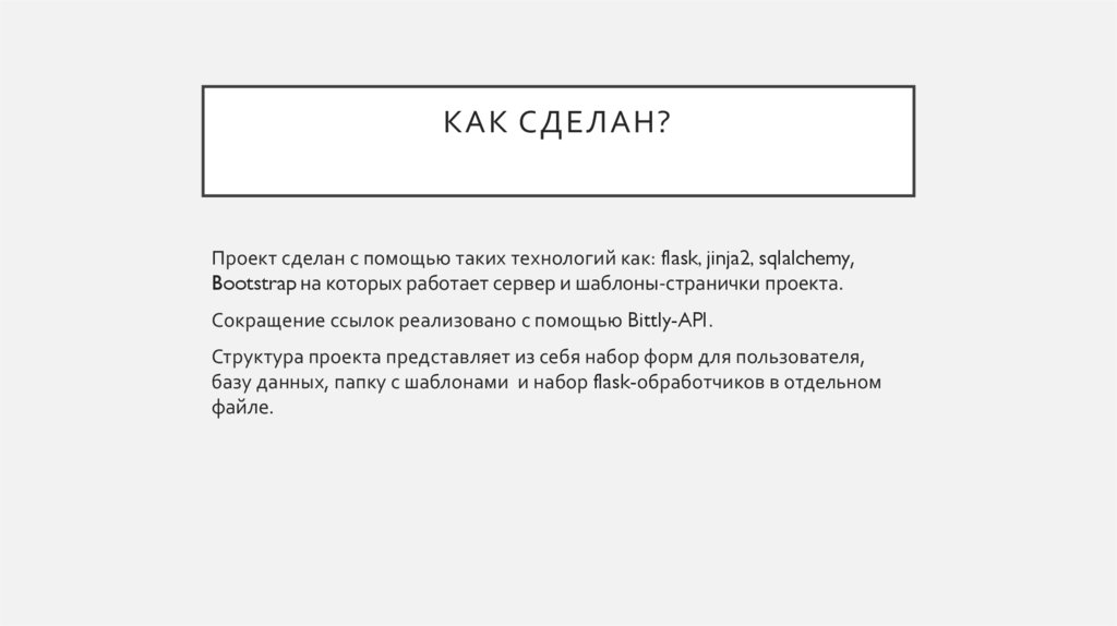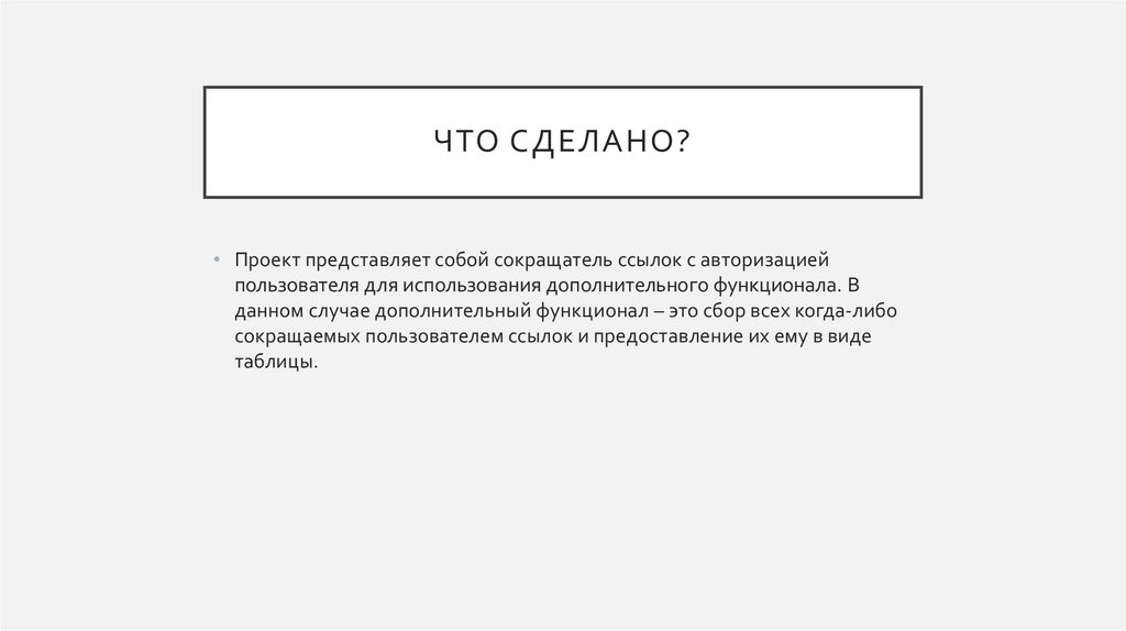 ЧТО СДЕЛАНО?• Проект представляет собой сокращатель ссылок с авторизацией