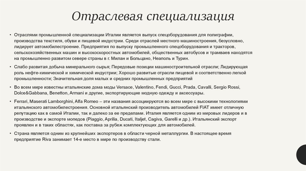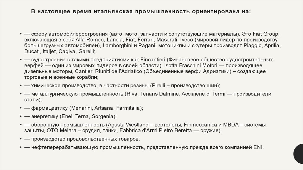 В настоящее время итальянская промышленность ориентирована на:• — сферу автомобилеростроения (авто, мото, запчасти и сопутствующие материалы). Это Fiat Group,