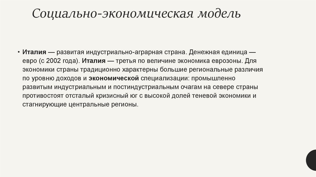Социально-экономическая модель• Италия — развитая индустриально-аграрная страна. Денежная единица —