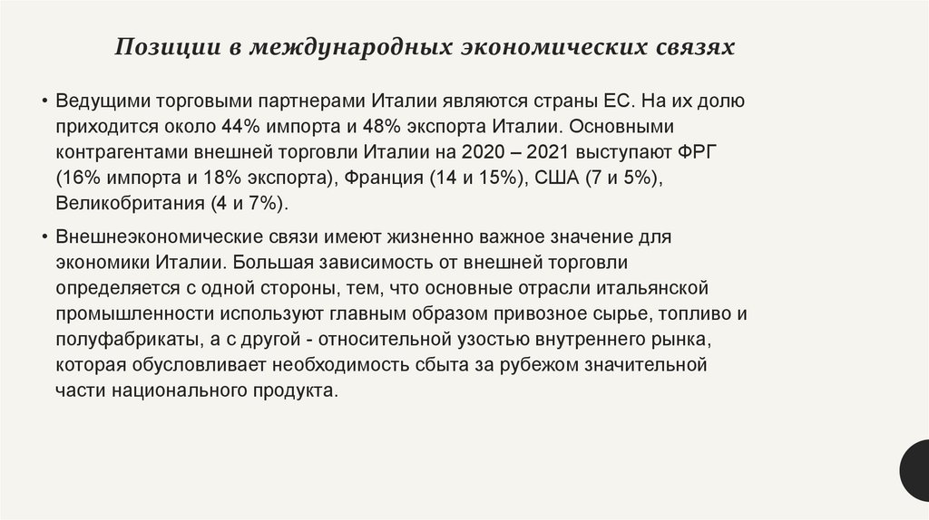 Позиции в международных экономических связях• Ведущими торговыми партнерами Италии являются страны ЕС. На их долю