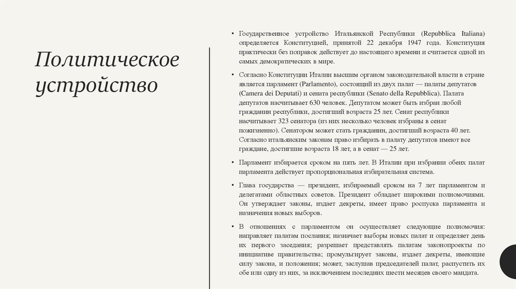 • Парламент избирается сроком на пять лет. В Италии при избрании обеих палат