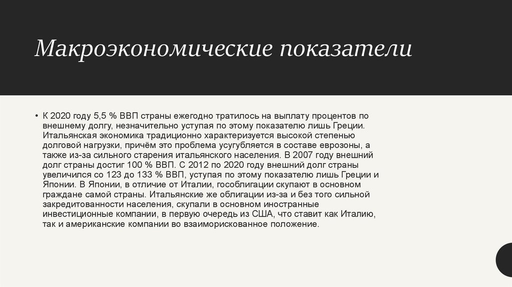 Макроэкономические показатели• К 2020 году 5,5 % ВВП страны ежегодно тратилось на выплату процентов по