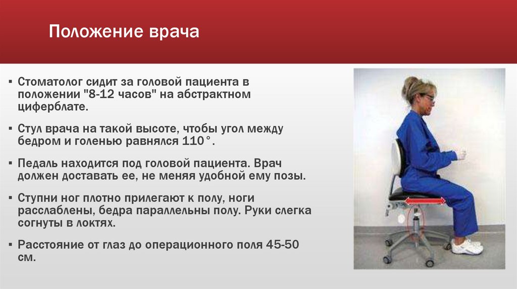 Положение врача▪ Стоматолог сидит за головой пациента в