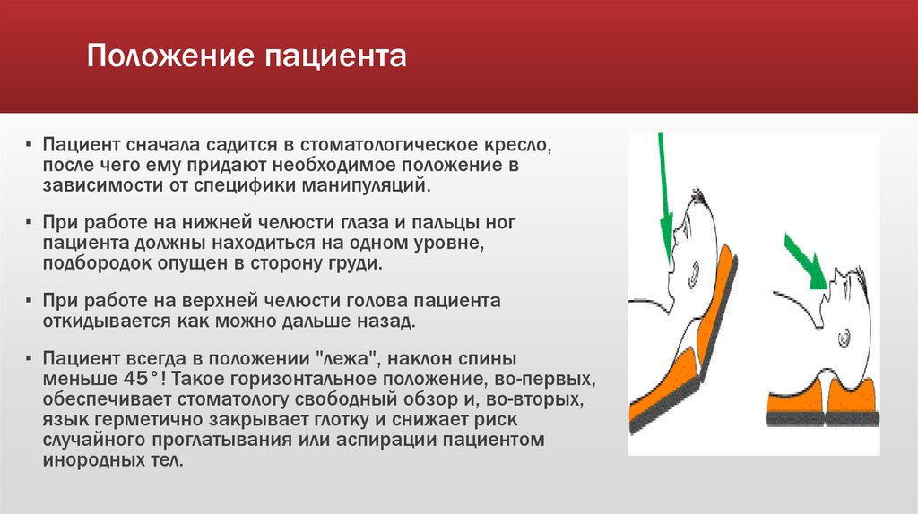 Положение пациента▪ Пациент сначала садится в стоматологическое кресло,