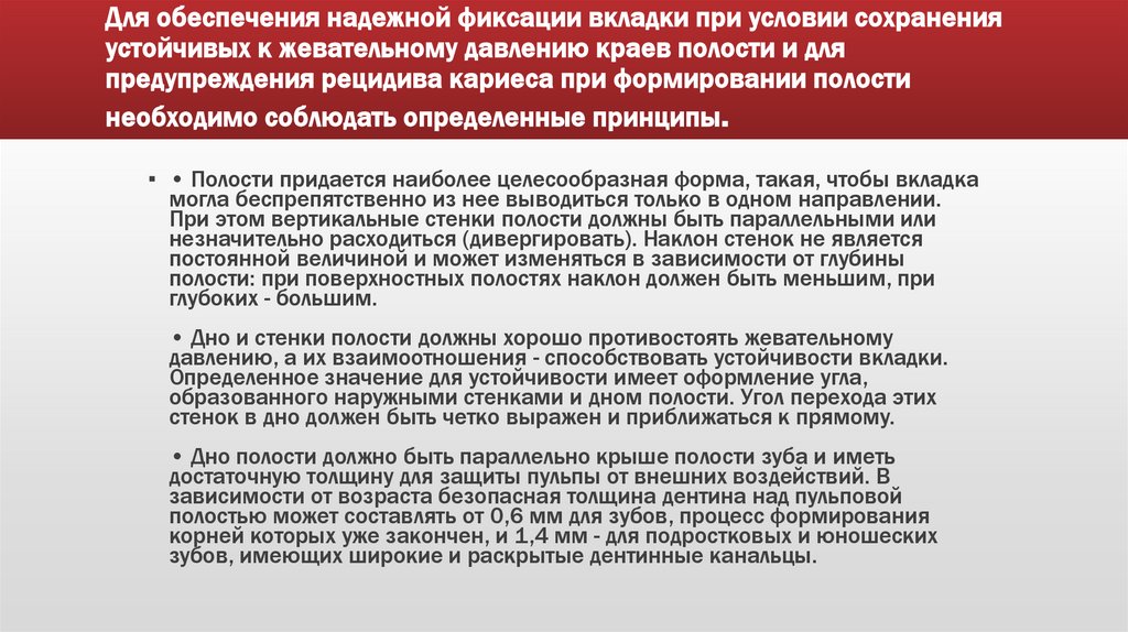 • Дно и стенки полости должны хорошо противостоять жевательному