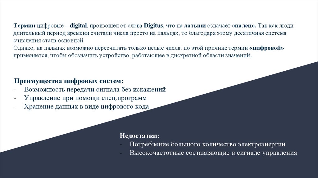 Термин цифровые – digital, произошел от слова Digitus, что на латыни означает «палец». Так как людидлительный период времени считали числа просто на пальцах, то благодаря этому десятичная система