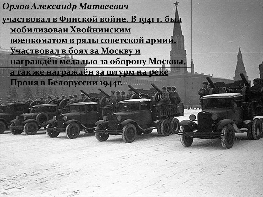 Орлов Александр Матвеевичучаствовал в Финской войне. В 1941 г. был