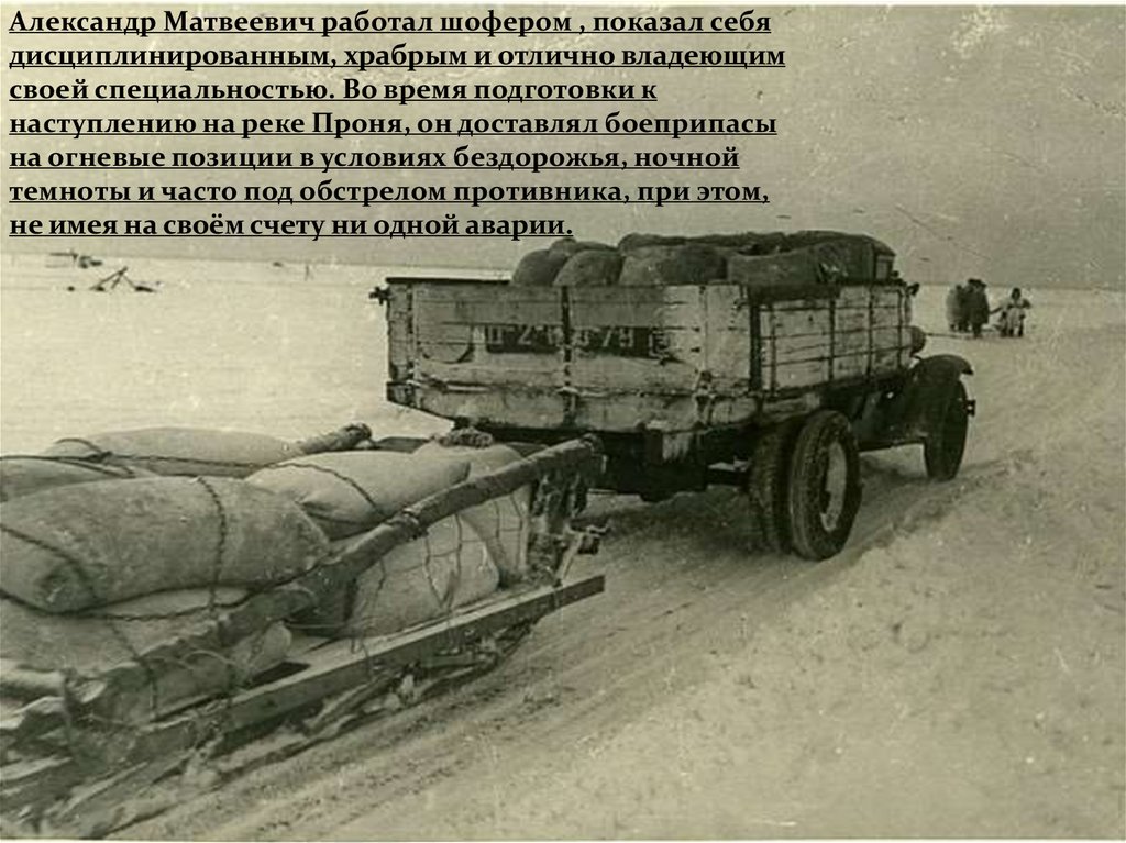 Александр Матвеевич работал шофером , показал себядисциплинированным, храбрым и отлично владеющим