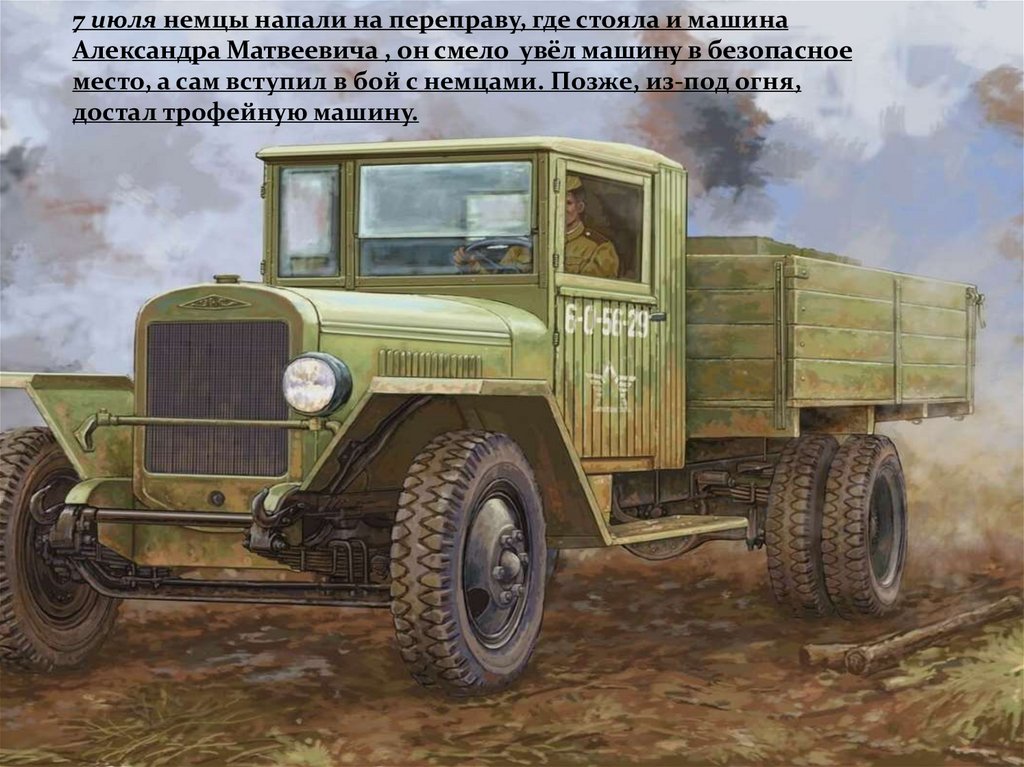 7 июля немцы напали на переправу, где стояла и машинаАлександра Матвеевича , он смело увёл машину в безопасное