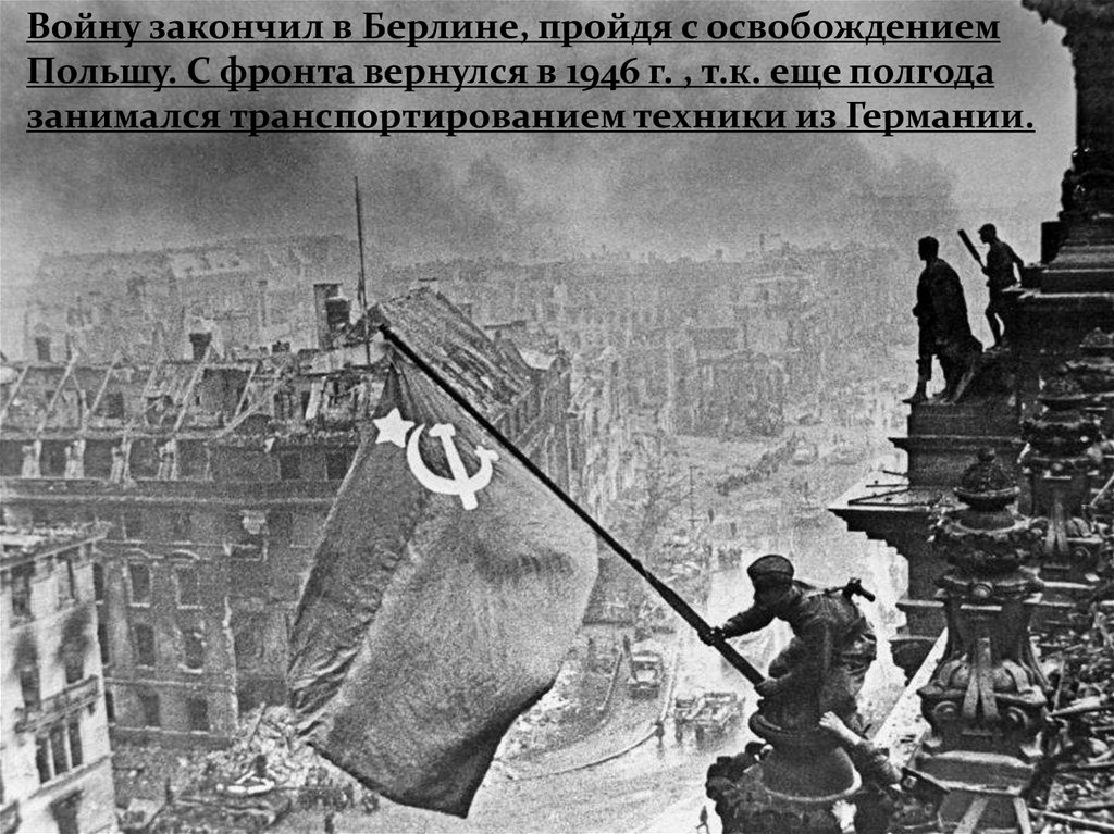 Войну закончил в Берлине, пройдя с освобождениемПольшу. С фронта вернулся в 1946 г. , т.к. еще полгода