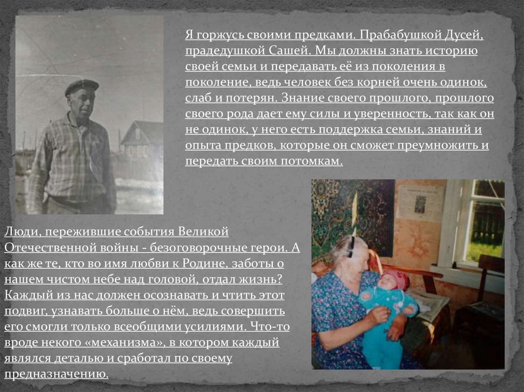 Я горжусь своими предками. Прабабушкой Дусей,прадедушкой Сашей. Мы должны знать историю