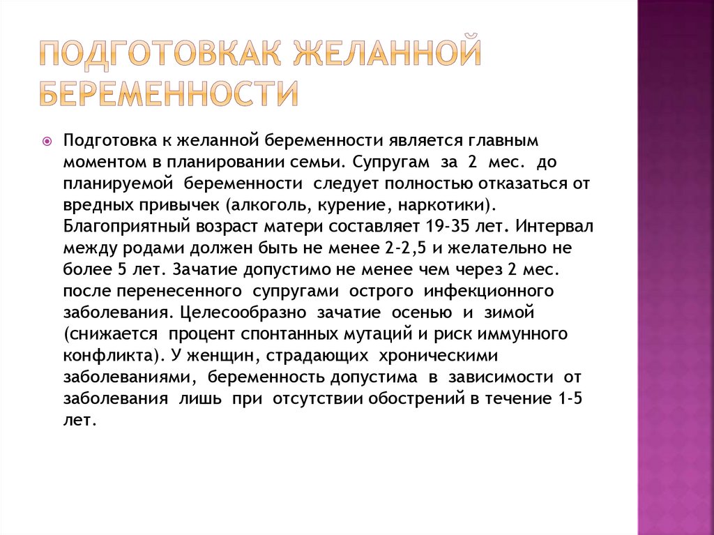 Подготовка к желанной беременности является главныммоментом в планировании семьи. Супругам за 2 мес. до