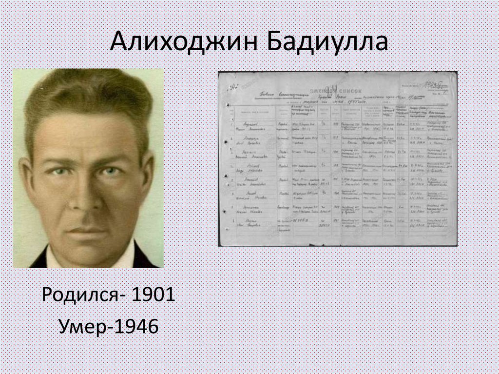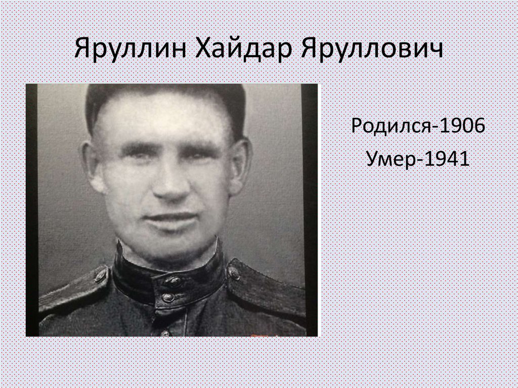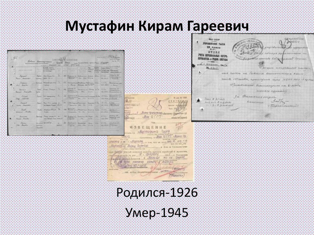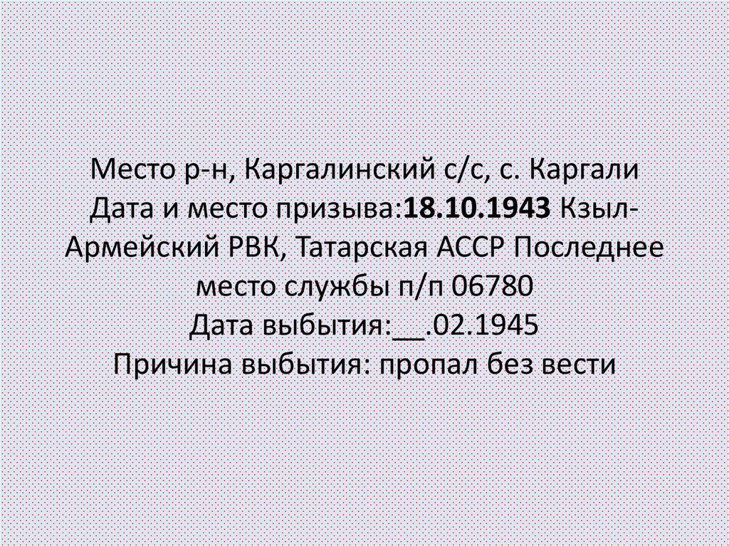 Место р-н, Каргалинский с/с, с. КаргалиДата и место призыва:18.10.1943 КзылАрмейский РВК, Татарская АССР Последнее