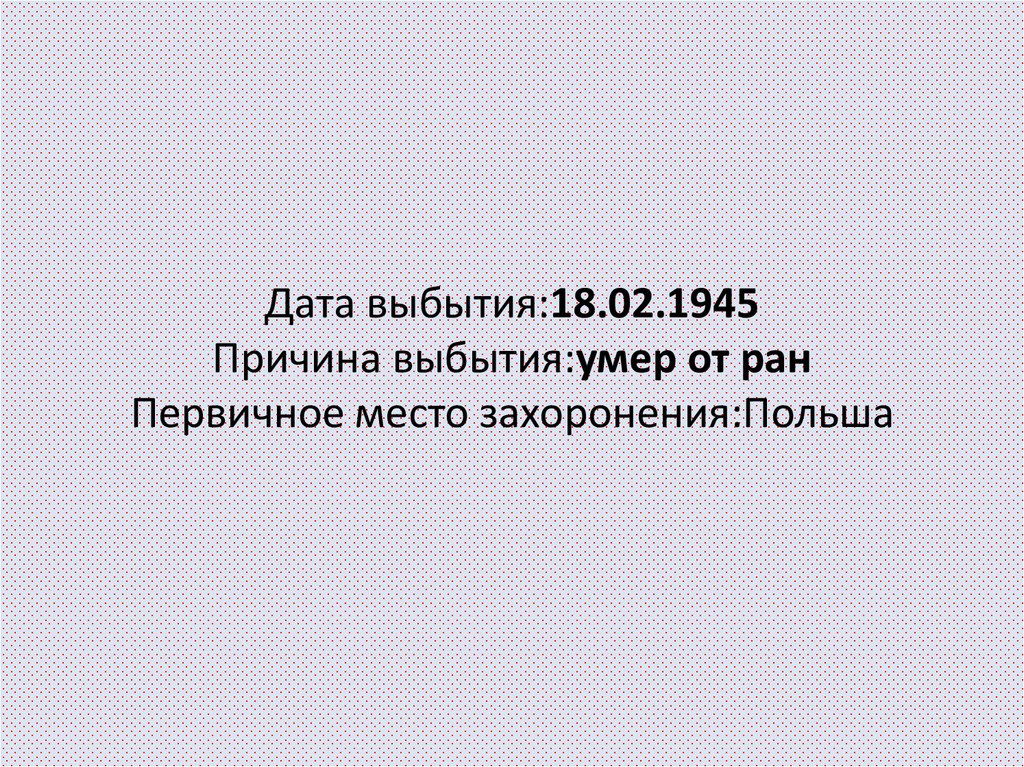 Дата выбытия:18.02.1945Причина выбытия:умер от ран