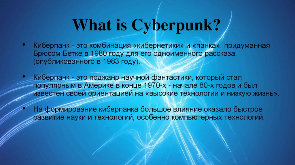 What is Cyberpunk?Киберпанк - это комбинация «кибернетики» и «панка», придуманная