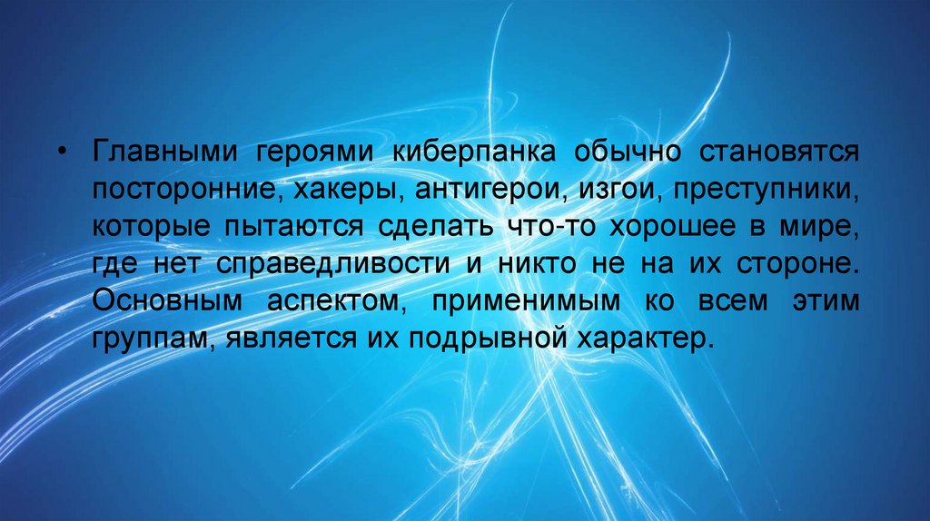 • Главными героями киберпанка обычно становятсяпосторонние, хакеры, антигерои, изгои, преступники,