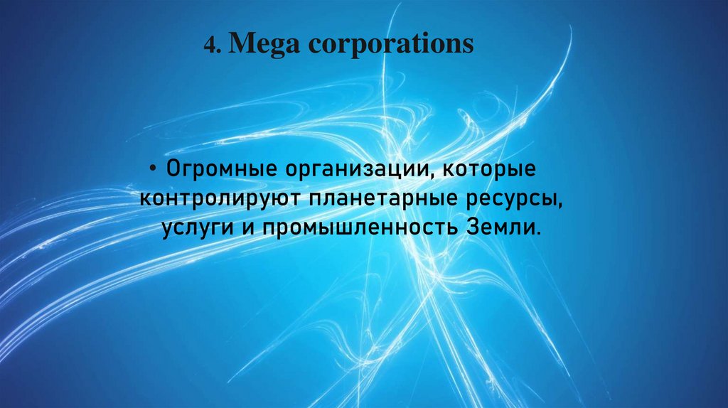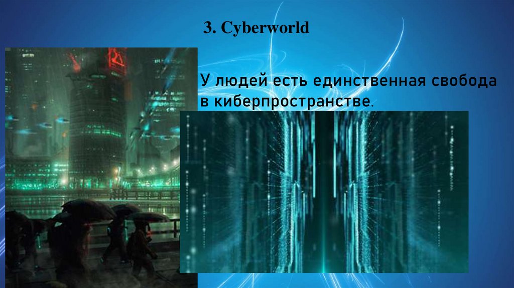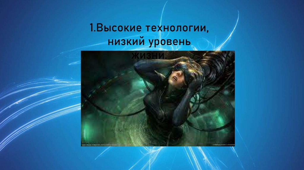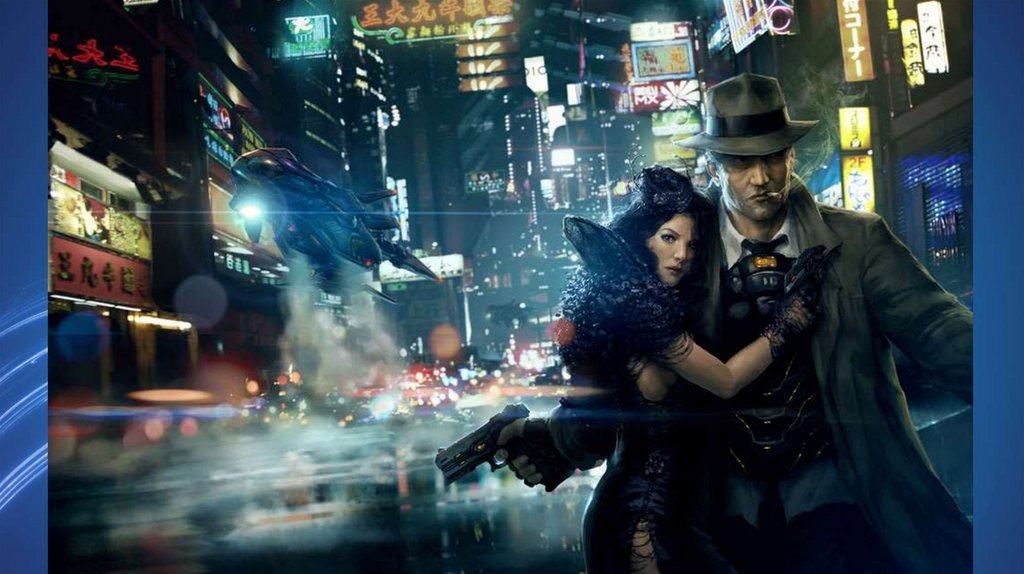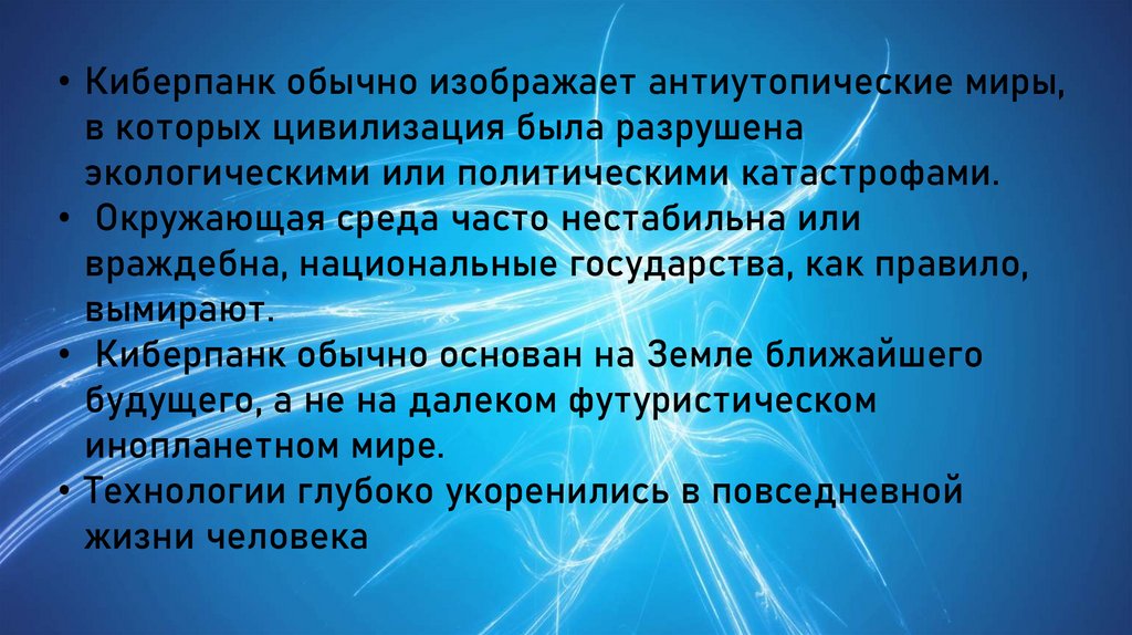 • Киберпанк обычно изображает антиутопические миры,в которых цивилизация была разрушена
