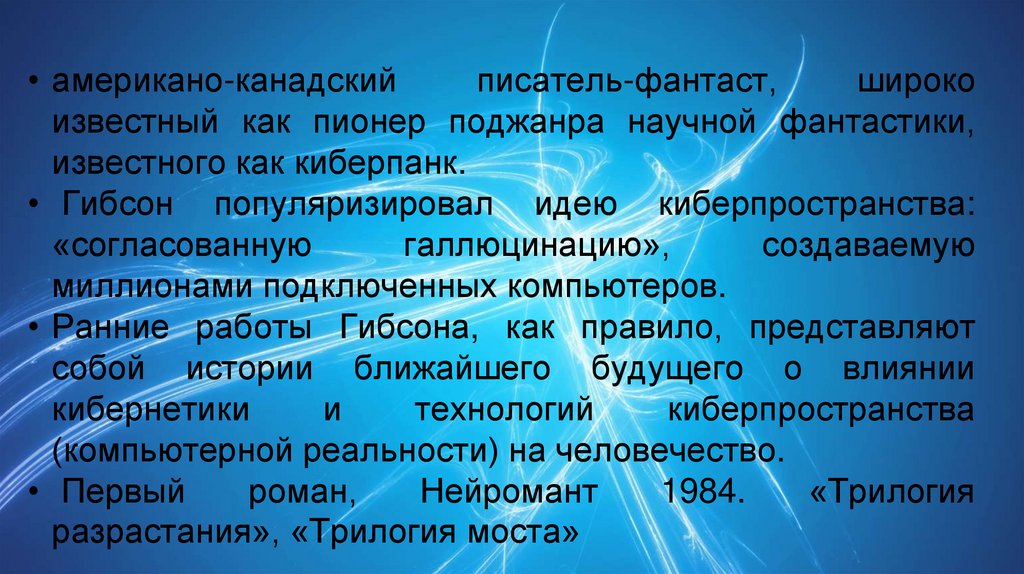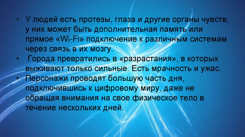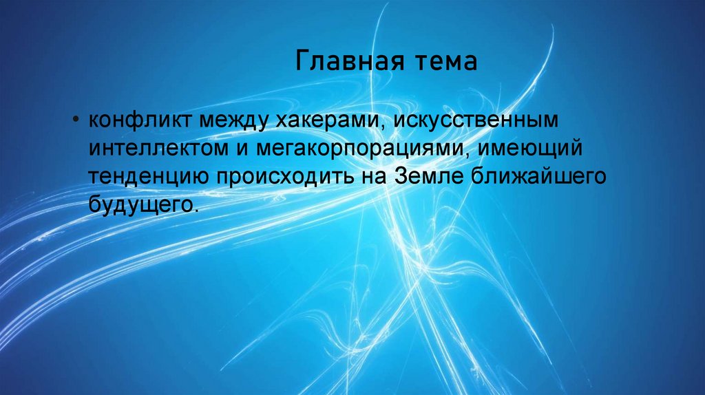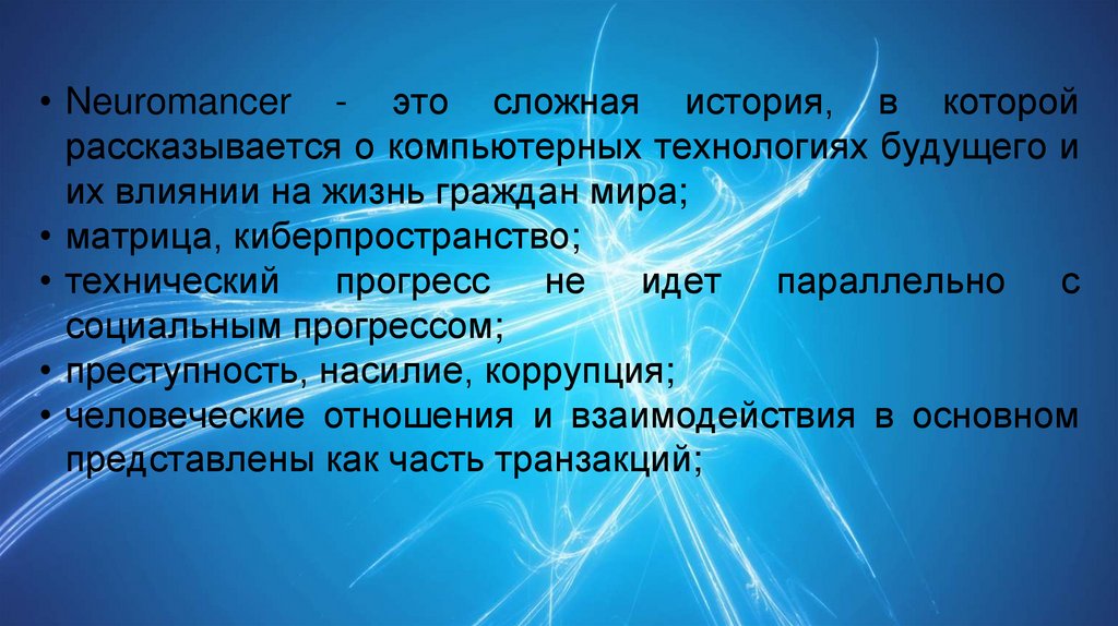 • Neuromancer - это сложная история, в которойрассказывается о компьютерных технологиях будущего и