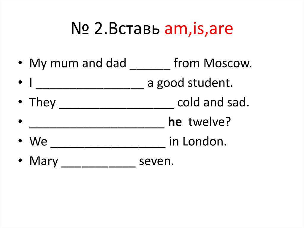 № 2.Вставь am,is,areMy mum and dad ______ from Moscow.