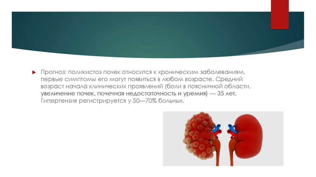 Прогноз: поликистоз почек относится к хроническим заболеваниям,первые симптомы его могут появиться в любом возрасте. Средний
