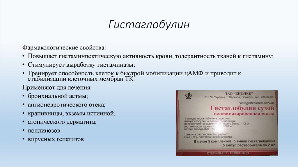 • Имеет свойства антигена, способствует выработке антигистаминовых