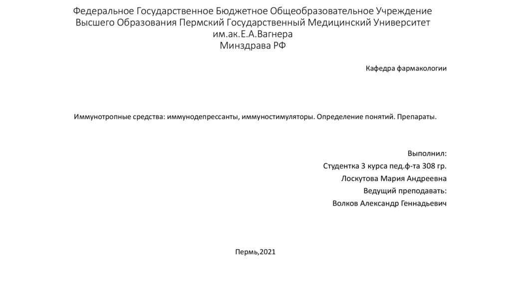 Федеральное Государственное Бюджетное Общеобразовательное УчреждениеВысшего Образования Пермский Государственный Медицинский Университет