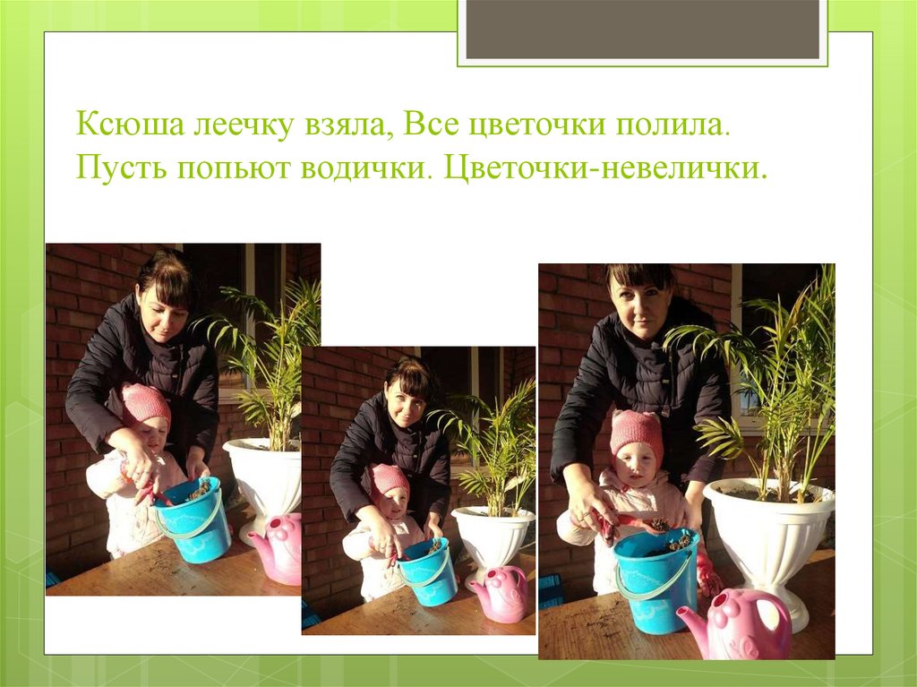 Ксюша леечку взяла, Все цветочки полила.Пусть попьют водички. Цветочки-невелички.