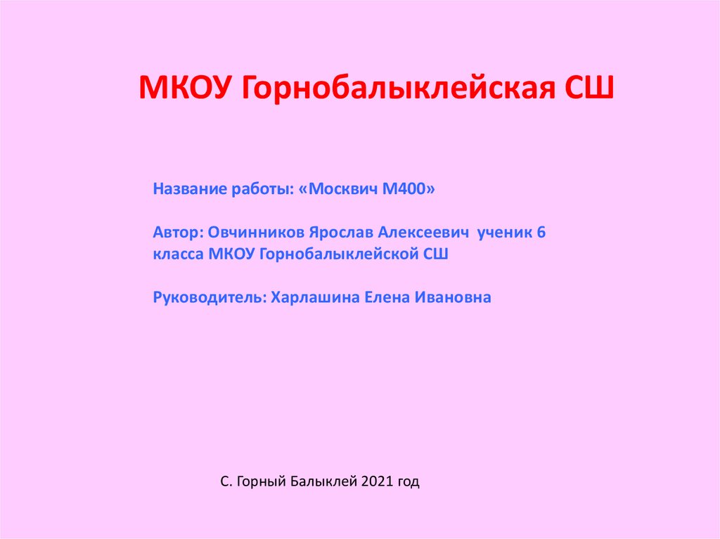 МКОУ Горнобалыклейская СШНазвание работы: «Москвич М400»