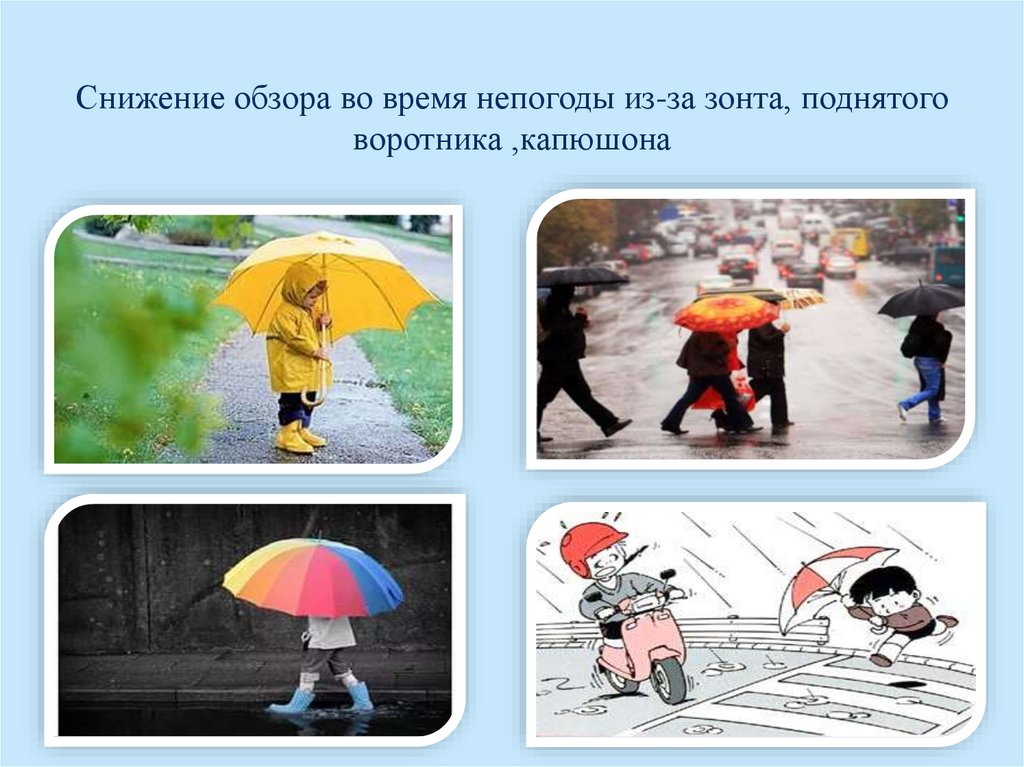 Снижение обзора во время непогоды из-за зонта, поднятоговоротника ,капюшона