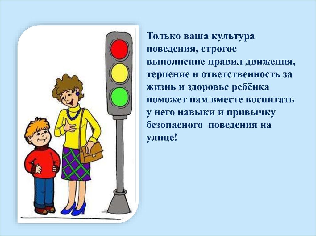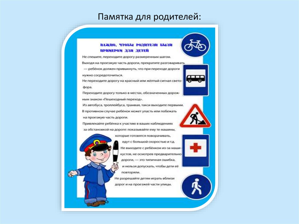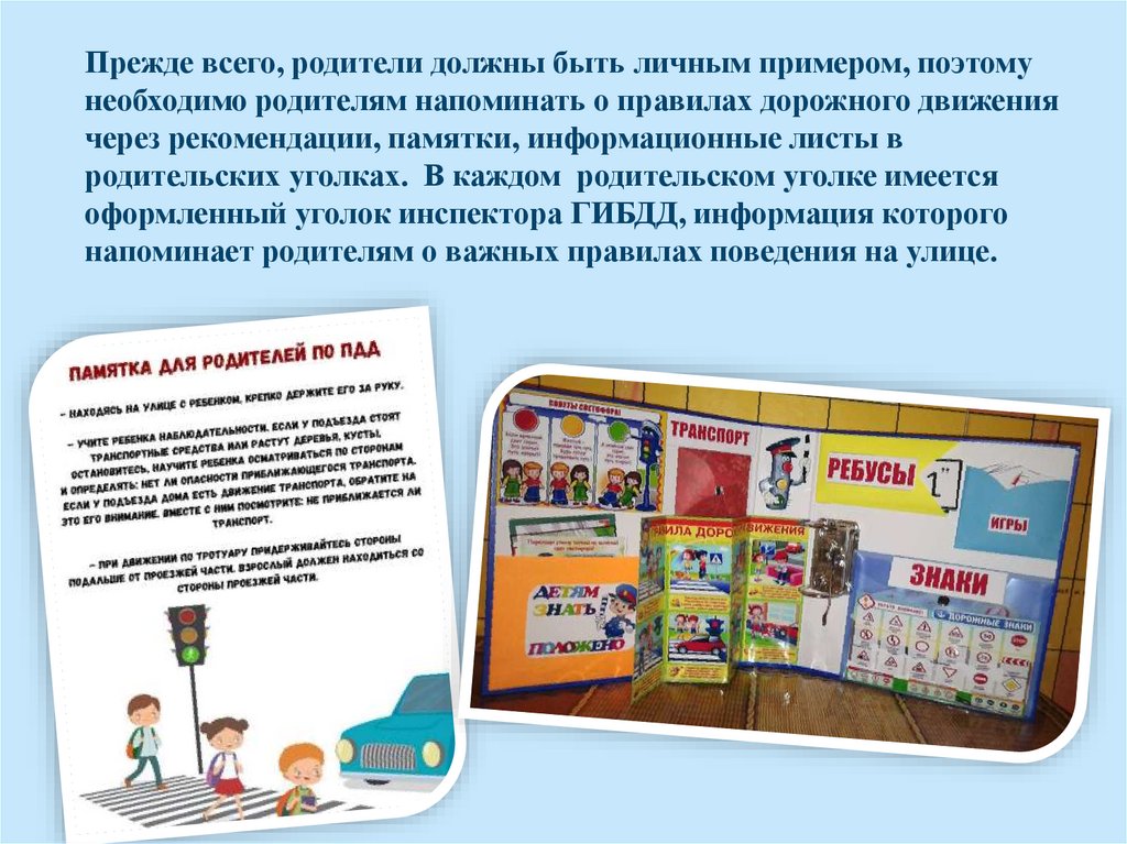 Прежде всего, родители должны быть личным примером, поэтомунеобходимо родителям напоминать о правилах дорожного движения
