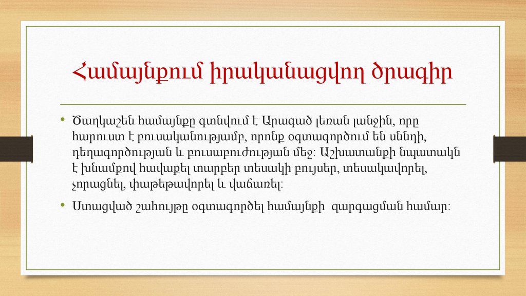 Համայնքում իրականացվող ծրագիր• Ծաղկաշեն համայնքը գտնվում է Արագած լեռան լանջին, որը