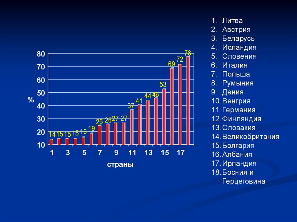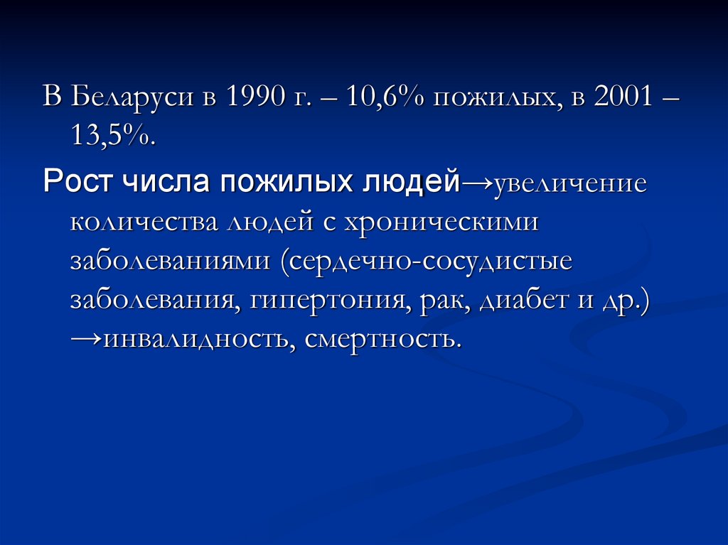 В Беларуси в 1990 г. – 10,6% пожилых, в 2001 –13,5%.
