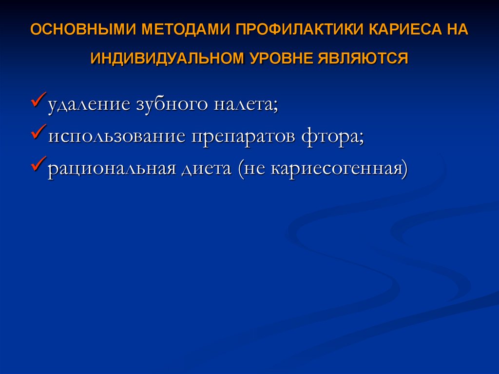 ОСНОВНЫМИ МЕТОДАМИ ПРОФИЛАКТИКИ КАРИЕСА НАИНДИВИДУАЛЬНОМ УРОВНЕ ЯВЛЯЮТСЯ