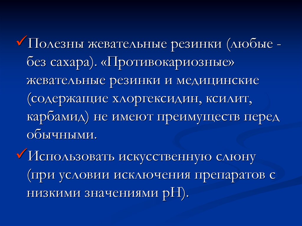 Полезны жевательные резинки (любые без сахара). «Противокариозные»жевательные резинки и медицинские