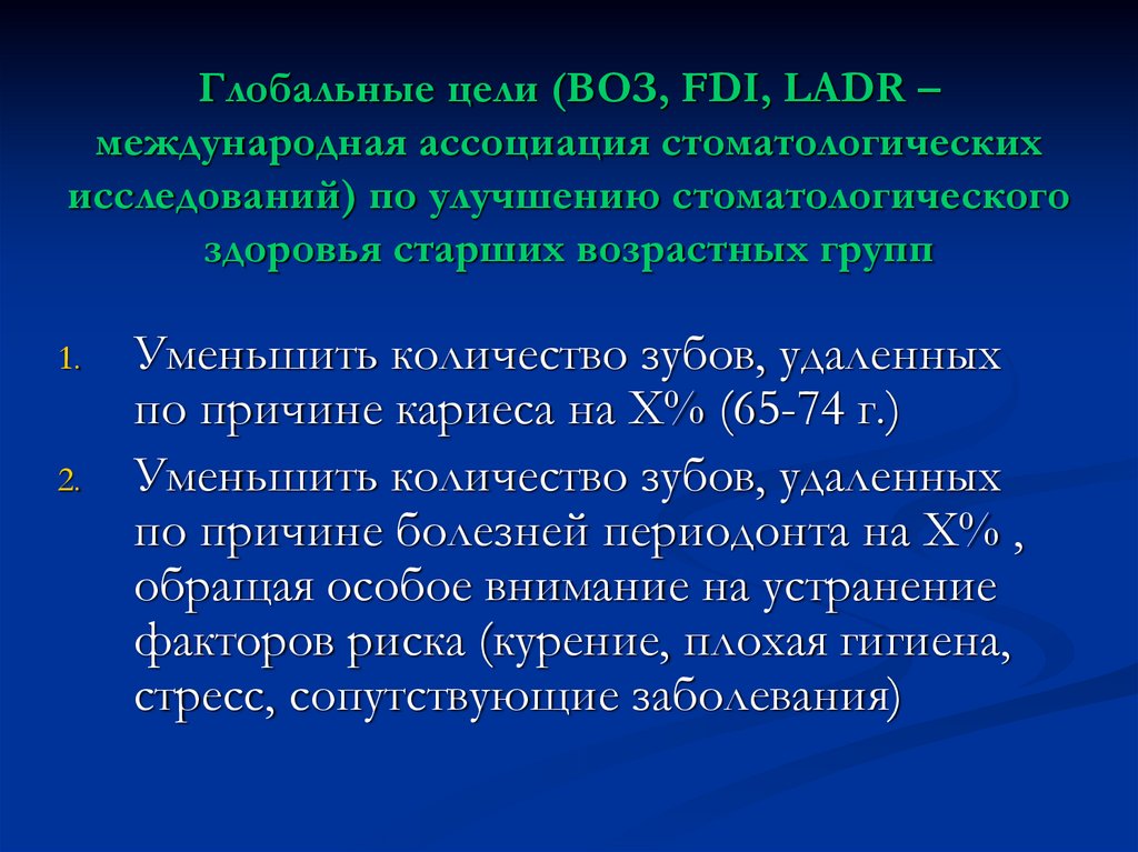 Глобальные цели (ВОЗ, FDI, LADR –международная ассоциация стоматологических