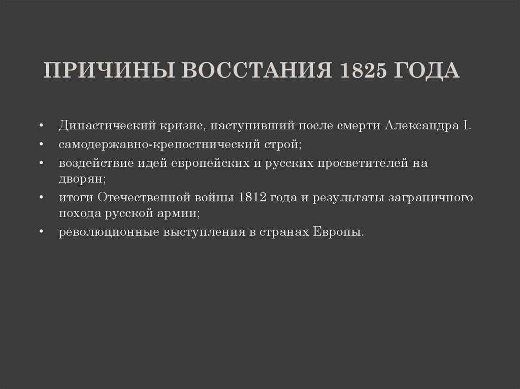 ПРИЧИНЫ ВОССТАНИЯ 1825 ГОДАДинастический кризис, наступивший после смерти Александра I.