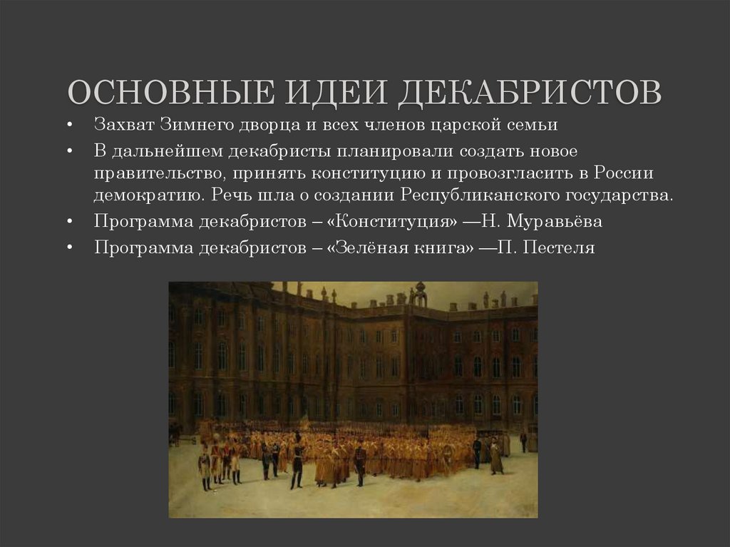 ОСНОВНЫЕ ИДЕИ ДЕКАБРИСТОВЗахват Зимнего дворца и всех членов царской семьи