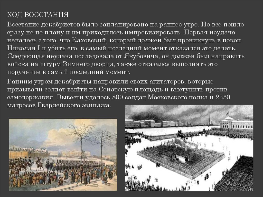 ХОД ВОССТАНИЯВосстание декабристов было запланировано на раннее утро. Но все пошло