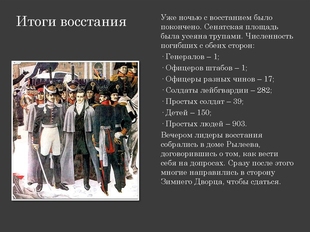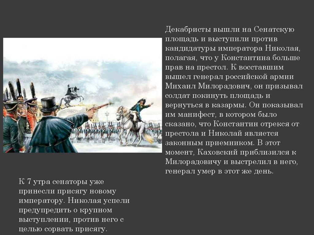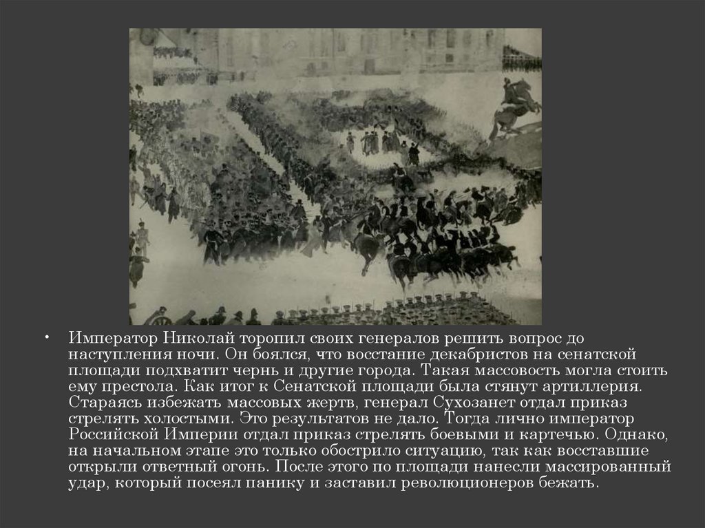• Император Николай торопил своих генералов решить вопрос донаступления ночи. Он боялся, что восстание декабристов на сенатской