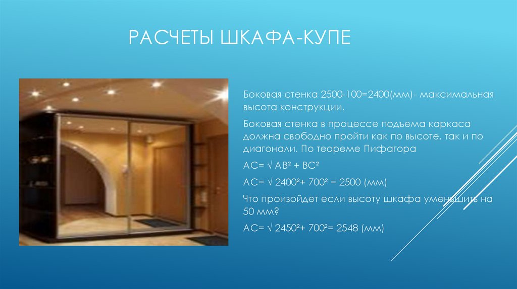 РАСЧЕТЫ ШКАФА-КУПЕБоковая стенка 2500-100=2400(мм)- максимальная