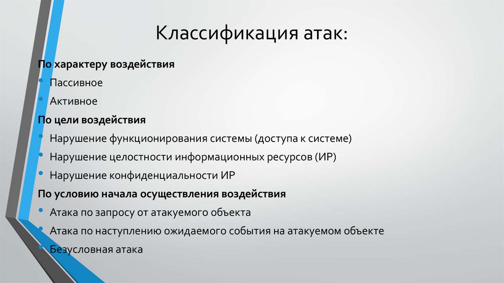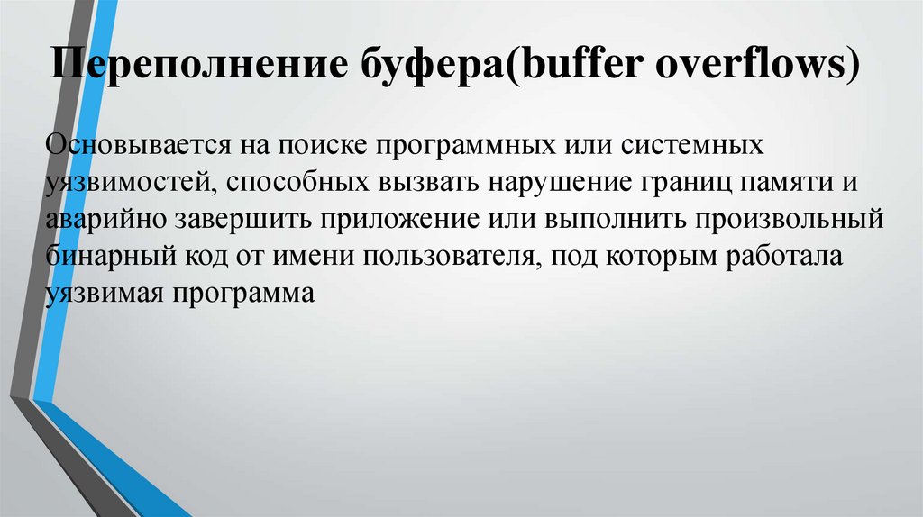 Переполнение буфера(buffer overflows)Основывается на поиске программных или системных
